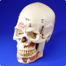 The finest 10 piece skull. The calvarium is horizontally sectioned and the jaw is spring-held. Skull base is sectioned sagittally on one side of the cribiform plate and the vomer is removable.